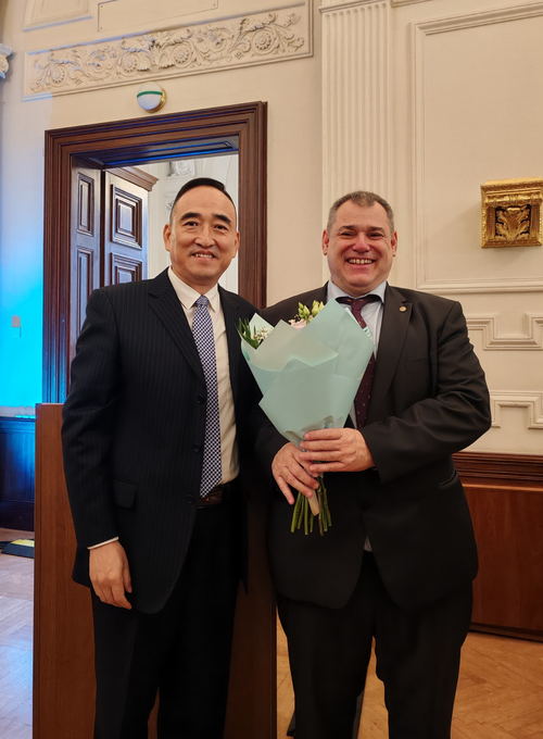 讲座结束后,匈牙利科学院语言与文学部主任博尔索斯·包拉兹(Dr. Borsos Balázs)为郝清新教授颁发了匈牙利科学院学术会员资格证书。