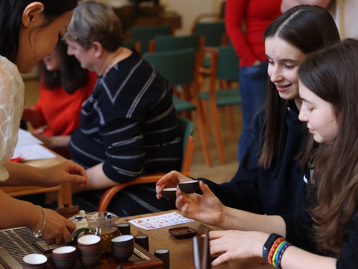 旁边的茶艺体验区热闹程度也不遑多让。在一片茶香氤氲中,孔院老师向师生们展示了传统茶艺流程,讲解了红茶、绿茶和茉莉花茶等茶种的口感差异。师生们争相品茶,沉醉在齿颊留香的余韵里。