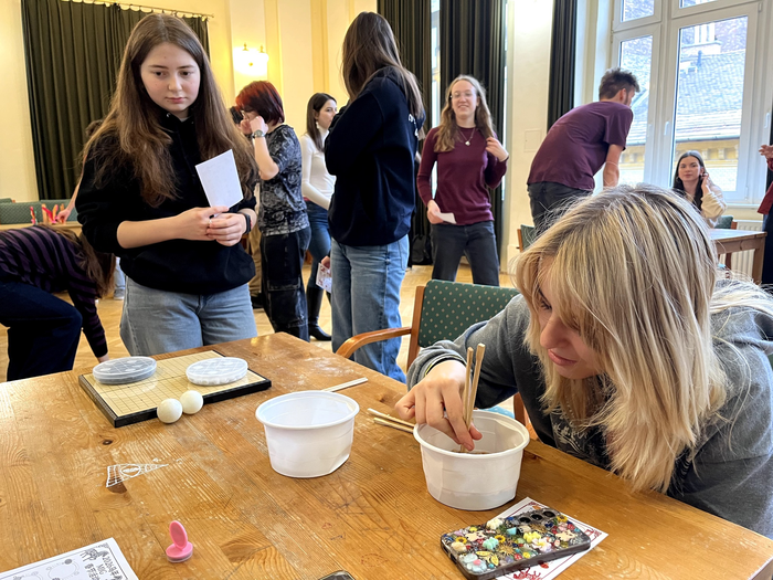 踢毽子体验区更是热闹,学生们无师自通,玩出了各种新花样。一个个毽子在空中翻飞,学生们的喝彩声此起彼伏。在筷子体验区,孔院老师设置了一分钟夹黄豆大挑战,师生们在趣味性十足的挑战中学会了筷子的正确用法,现场一片欢声笑语。