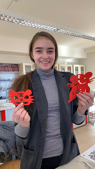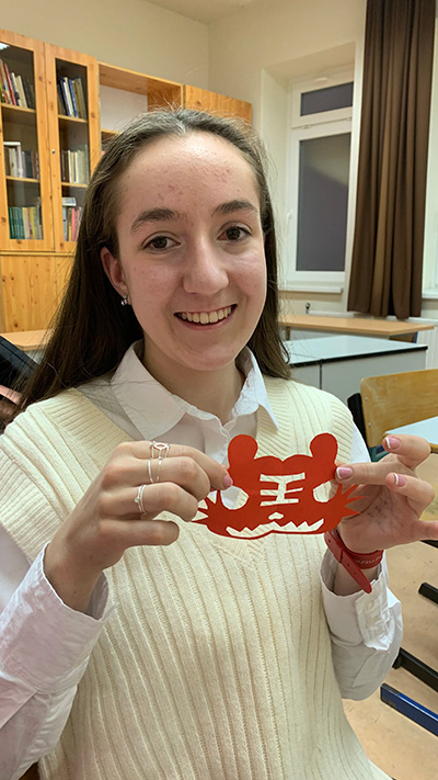 受到疫情的限制,这个虎年春节,是8-10年级汉语班学生庆祝的第一个春节,大家先在课堂上学习了农历的计算方法、十二生肖的故事,了解了春节对于中国人的重要意义。在大年初一这一天,学生们穿戴打扮,十分兴奋地来到活动现场,一起布置中国结、剪纸和春联,让节日气氛洋溢在小小的教室中。
