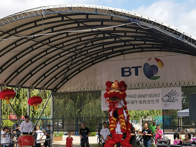 舞台下,各单位的展台展示着多彩的中国文化,精彩纷呈,应有尽有。此外,还有几只可爱的狮子,红色,黑色,白色活跃在舞台前的大草地上。匈牙利的孩子们坐在爸爸的肩膀上看得津津有味,想必他们会觉得它们和匈牙利著名景点“链子桥”上的石狮子看起来有些相像,却又多了些东方的味道呢。