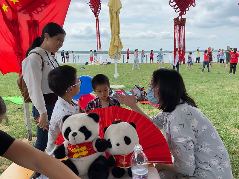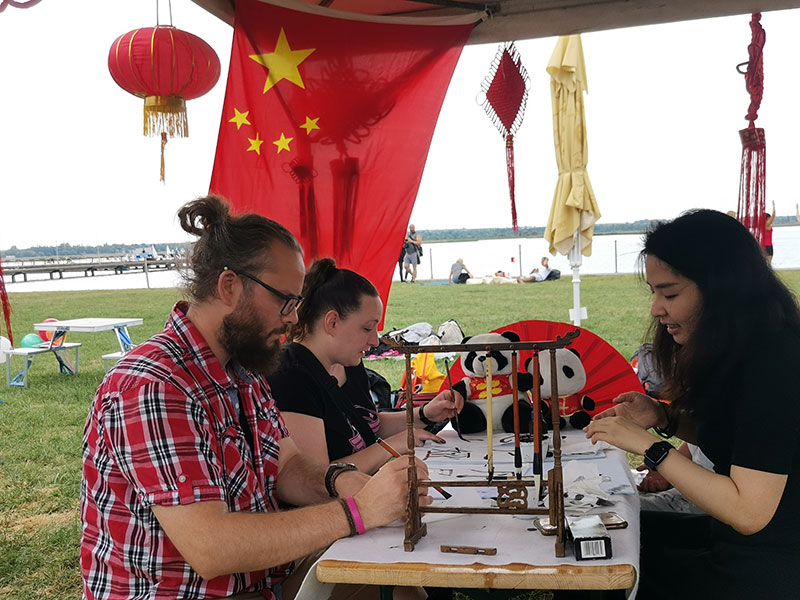 孔子学院此次为大家带来的文化活动展示包括:跳棋,书法,毽子,脸谱绘画,学习使用筷子以及汉服。天气炎热,但旅匈华人及匈牙利友人的热情如湖上的好天气。匈牙利的小朋友们从来没有见过毽子,好奇得前来询问在哪里可以买到。五彩的毽子在绿色的大草坪上空飞来飞去,大家踢得不亦乐乎。