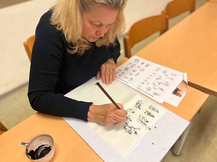 在本轮国画课程中,霍尔瓦特·尧尼斯先生不仅介绍了国画的创作技巧,同时还将焦点着眼于人物绘画的深度探讨,包括姿态、神态和服饰等方面的细致描绘。霍尔瓦特·尧尼斯先生以其深刻的艺术见解和丰富的教学经验,为学生提供了一个独特而深入的绘画体验,激发他们对中国艺术更深层次的理解和兴趣。