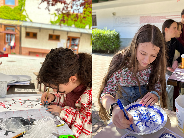 潘萱尔老师负责的摊位为学生们提供了丰富的选择,包括书法、国画、绘制青花瓷及脸谱图样。老师们认真指导,学生们认真学习。在体验中感受汉字和国画的魅力、了解青花瓷及京剧文化。