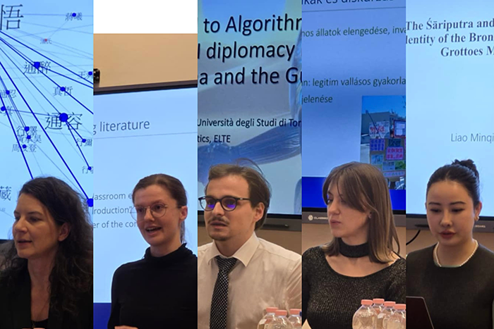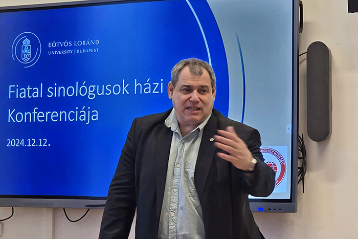 会议下半场,廖敏倩(Janine Liao)以图像学方法结合考古证据探讨敦煌壁画《劳度差圣斗变》中“金鼓”的身份,提出其为铜鼓并解读其纹样的象征意义,以深化对该主题及其文化内涵的理解。谢天宇(Sebeszta Miklós)探讨了冯骥才与伤痕文学,深入分析了文学作品中对历史伤痕的反思与表达。王哲(Olajos István)关注了萨满的超自然力量,追溯和连接了不同时期的宗教活动人物。孔茗(Szigethy Balázs)探讨了部首系统在非母语汉字学习中的作用,为汉字教学提供了新的教学方法。于玄烨(Ádám Koi)则从石油到算法例举中国与海湾国家之间智能公共外交的觉醒,探讨了现代外交的智能化新趋势。